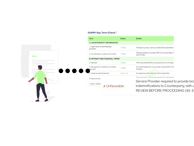 Our tool evaluates your agreement across 14 contract terms that are key to getting paid on time and in full, based on DUPAY's experience working with hundreds of creators.